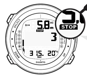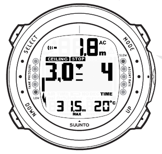 注意:一旦在大于六米的地方,显示“STOP”即表示你违反了上升速度,本次潜水必须执行强制安全停留方可升水。