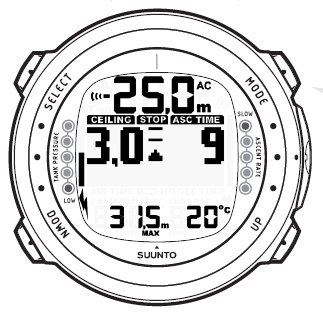 技术要求:任何时候,一旦超过了免减压时间,必须立即结束本次潜水。表面会如图六.1显示。“CEILING”和下面的3.0,表示上升到最高不超过3.0米的位置。“STOP”表示现在进入减压停留阶段。等于和向上箭头表示现在必须马上上升。“ASCTIME”表示包括安全停留的总上升时间为“9”分钟。于是,你应该以不超过上升速度的速度上升!这时,“ASCTIME”会是闪烁状态。