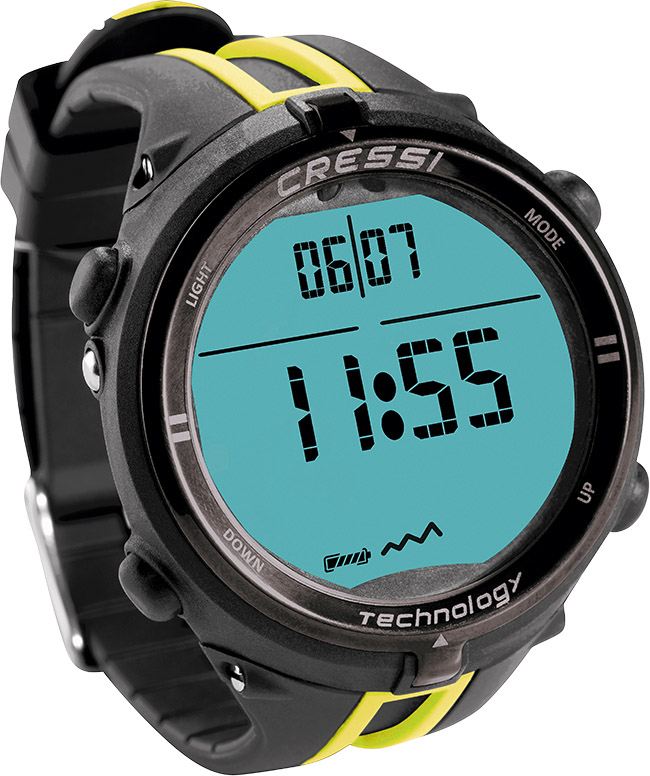 表面是矿物质玻璃,高级金属材质外壳,150米防水。采用橡胶表带及不锈钢表扣,新型的CRESSI双混合RGBM算法综合了Bruce Wienke建模公式以及RGBM因子,给出科学的安全减压时间,并可以综合多日潜水行程,测算安全的潜水方式。