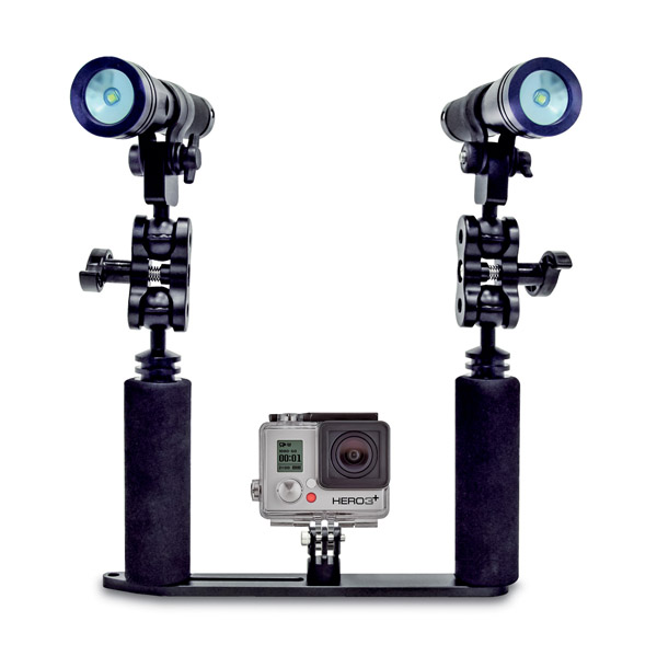 Big Blue最新推出适用于GoPro相机的全机配置,包含一组托架基座、两支双球灯臂夹、两副YS型圆球座以及两盏Big Blue的AL-1000XWP潜水摄影手电筒。AL-1000XWP的光源输出亮度为1000流明,光束角为120o,色温则是6500K,电源为可充电式的锂离子电池。可单独购买手电筒。