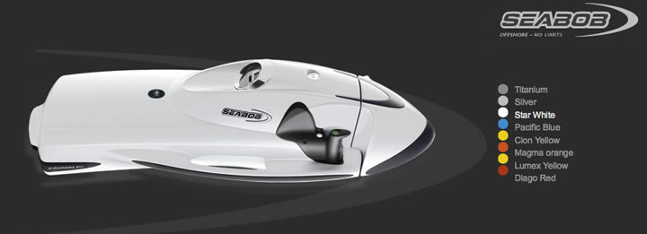 Seabob F7能够潜到水下40米深,可以持续运行60分钟,可以手动拍打10个转动装置来改变它的速度,潜水者运用体重来改变喷水器的倾斜角度来控制方向。它在水面的速度可达22公里每小时,在水中的速度也能达15公里每小时,整个喷水器重64公斤,在水中的浮力是8公斤。有蓝、银、红、橙、黄、白六种颜色,以及钛或铬合金供你选择。
