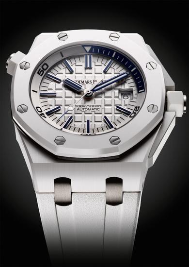 爱彼不仅预先推出搭配钛金属表壳、白色陶瓷表圈、按钮、表冠和机芯夹板的皇家橡树格林威治标准时间概念陀飞轮腕表(见“专业工艺”媒体资料),还带来了这款出众的皇家橡树离岸型系列Diver 潜水腕表,其中包括迷人的白色设计和超硬复合材质,实属探索海洋深处的最佳伴侣。