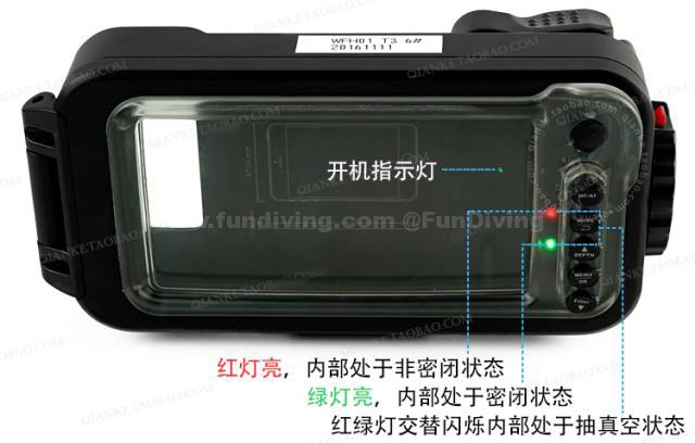 置入手机后,密闭盖的红灯会亮起,此时处于非密闭状态,需要抽走手机壳内部空气达到密闭状态才能携带下水。抽真空时密闭盖的红绿灯会交替闪烁,代表此时处于抽真空状态,而在密闭状态下,密闭盖的会亮起绿灯。