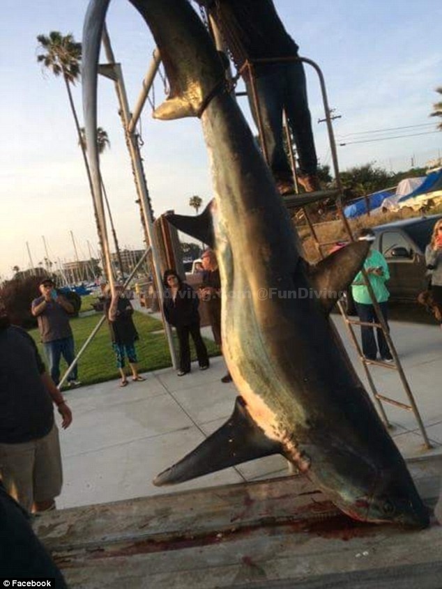 近日,美国加利福尼亚海岸的渔夫约翰.利史(John Lish)捕获一条长达20英尺(约合6.1米)、重达550磅(约合250公斤)的长尾鲨。
