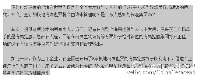 从2013年正佳极地海洋世界动工的新闻开始,从鱼类到鳍足类(海狮海豹海象)直到今年1月刚刚入馆的白鲸,北极熊,这个“位于正佳广场西侧二、三层,总建筑面积超过5.8万平方米,从野生动物救护中心以及国内外大型海洋馆共引进500种超30000只极地海洋动物,是目前为止全球首座同时也是规模最大的室内空中极地c”正在成为伤害动物,误导公众,赚黑心钱的新思路。这个阴损的思路从何而来呢???在目前的大陆,这么有“想法”的当然是两大巨头之一的海昌控股咯(另一个巨头...大家请看截图)。