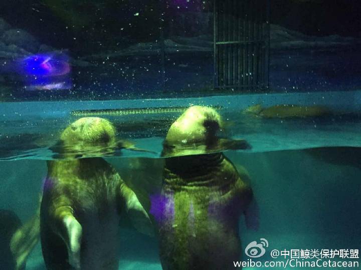 可是在广州的一个商场里,就有2头幼年海象泡在充满氯气的人工海水里。他们再也没有机会感受沙滩、海浪、冰雪;也再见不到母亲和族群。等待他们的只有日复一日的表演,年复一年的被奴役。