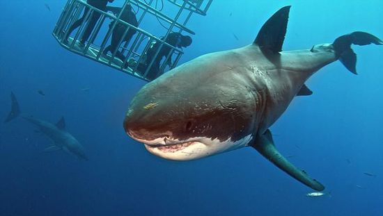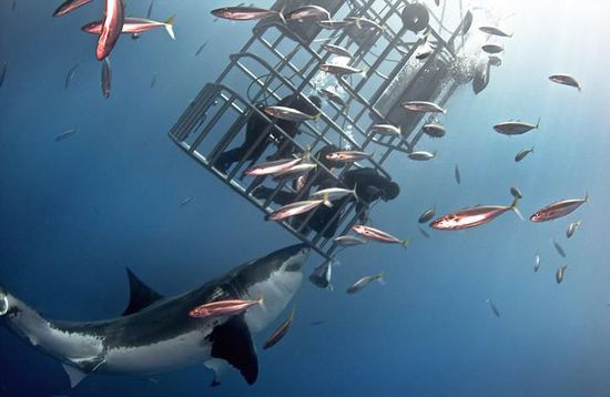 近日,在墨西哥瓜达卢佩圣母岛海岸,一名潜水员通过向大白鲨投喂食物将其引诱至笼子边,将他的手臂伸出,轻轻抚摸了大白鲨的鼻子。这一惊魂时刻被摄影师记录了下来。据悉,大白鲨通常可长达15英尺(约4.6米),重量则可达到5000磅(约2268千克)。2015年11月,曾有一名潜水员游到瓜达卢佩圣母岛海域,与被公认为世界上最大的大白鲨“深蓝”进行了面对面交流。“深蓝”年纪大约50岁左右,2013年开始出现在人们的视线中。摄影师曾公开过“深蓝”与笼子中的潜水员们嬉戏的画面。