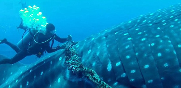 整个过程耗时仅30秒,在这个过程中,鲸鲨非常安静,就像是知道潜水员是为了救他而来的一样。