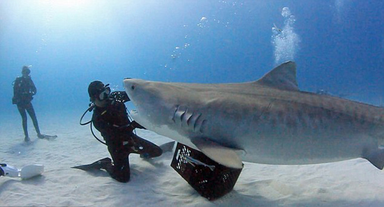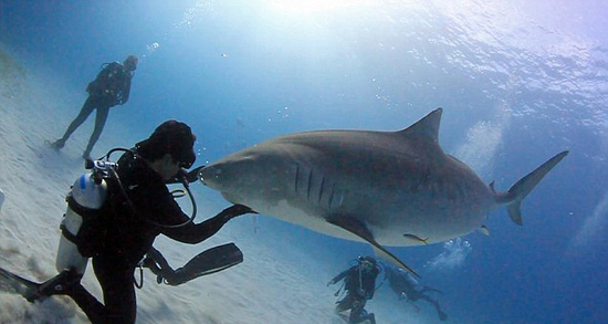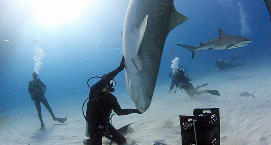 众所周知,鲨鱼食肉成性,凶猛异常,令人避之唯恐不及。近日,美国男子伊莱马丁内斯(Eli Martinez)却丝毫不畏惧,让重达一吨的虎鲨在他的手掌上表演了180度旋体,并称自己是有史以来第一个与鲨鱼共舞的人。