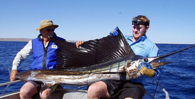 布伦德尔把船停在澳大利亚西部的宁加卢海岸,准备捕一条旗鱼。经过一场精疲力尽的“猫和老鼠”式的对抗,一条旗鱼终于上钩。
