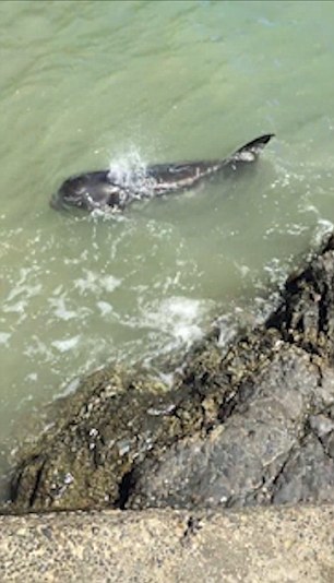 几个乘坐小艇的渔民很快过来,将这只海豚拖回到了深水区。不过,海豚似乎已经放弃了挣扎,它在水里打转,似乎已经不能很好地浮到水面。