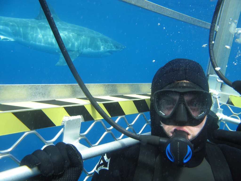 坐进玻璃潜水箱里,不用湿身就可欣赏海底的大白鲨。