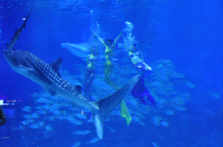 最妙的是,长达7米的几条大鲸鲨看到美女仿佛都兴奋了一样,在池子里来回的游来游去。有几次,紫色的人鱼伸着手向斜对角游去时,甚至与大鲸鲨撞了个满怀。而那些拖着长尾巴的燕鱼、巨骨舌鱼、领航鱼、磨盘大的鳐鱼就围在美女周围,成为“舞台上”活泼的“配角”。