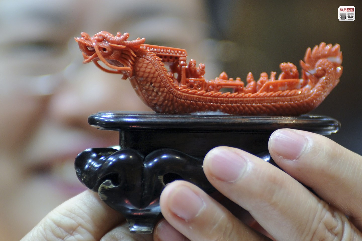 在珊瑚大面积打捞的背后隐藏的是巨额的利益冲动。作为价格昂贵的奢侈品,珊瑚艺术品在中国有非常好的销路,图为2011年5月13日,台北,一名售货员正在展示用红珊瑚雕刻出来的龙舟。AFP PHOTO / Sam YEH