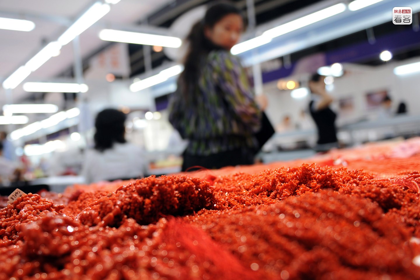 2008年9月20日,香港举办世界珠宝展,台湾的珠宝商带来了大量的各种红珊瑚制品。 AFP PHOTO/TED ALJIBE