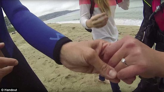 上岸后Markie单膝跪地给Sarah戴上戒指