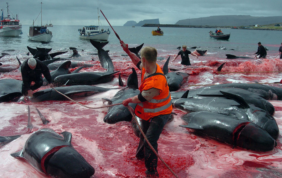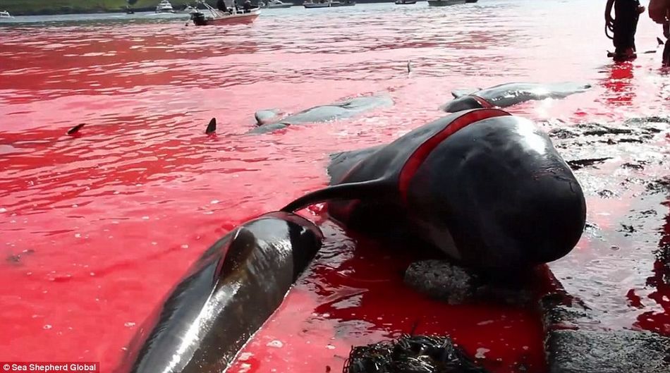 近日,丹麦海外自治领地法罗群岛,深蓝色的海水变成了红色。染红海岸线的不是别的,而是250头领航鲸的鲜血。媒体公布的照片显示,当地居民将鲸鱼赶到岸边,并用刀和鱼叉杀死他们,由于被杀死的鲸鱼数量众多,鲜血已经将整片海域染成红色,场面十分骇人。