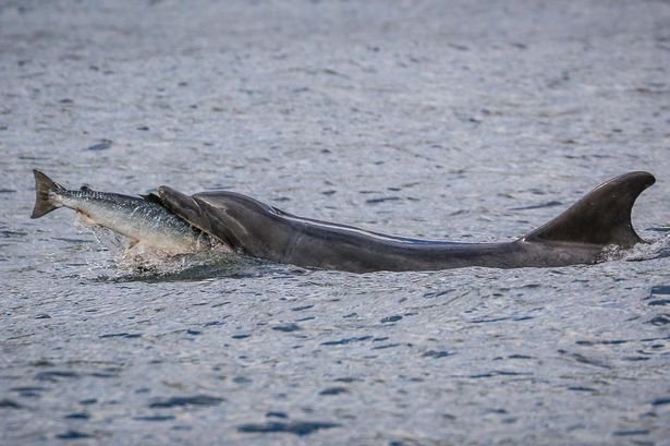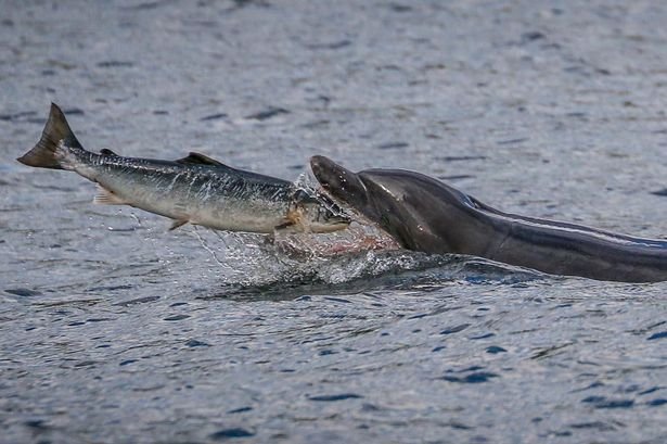 据英国《每日镜报》报道,英国40岁的导游萨拉·佩恩(Sarah Pern)在苏格兰东海岸拍到到宽吻海豚捕食大马哈鱼的精彩一幕。照片显示,一条大马哈鱼刚跃到空中,一只宽吻海豚随即冲出海面,将大马哈鱼吞入口中。
