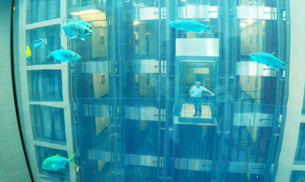 在德国柏林的雷迪森酒店,有一个世界上最大的独立圆柱体水族馆,高达82英尺(约25米,大约8层楼高)。在这栋水族馆中间,有透明的升降电梯,游人可以近距离接触海洋生物,建造这栋别致的水族馆花费了1280万欧元(约合人民币8694万元)。