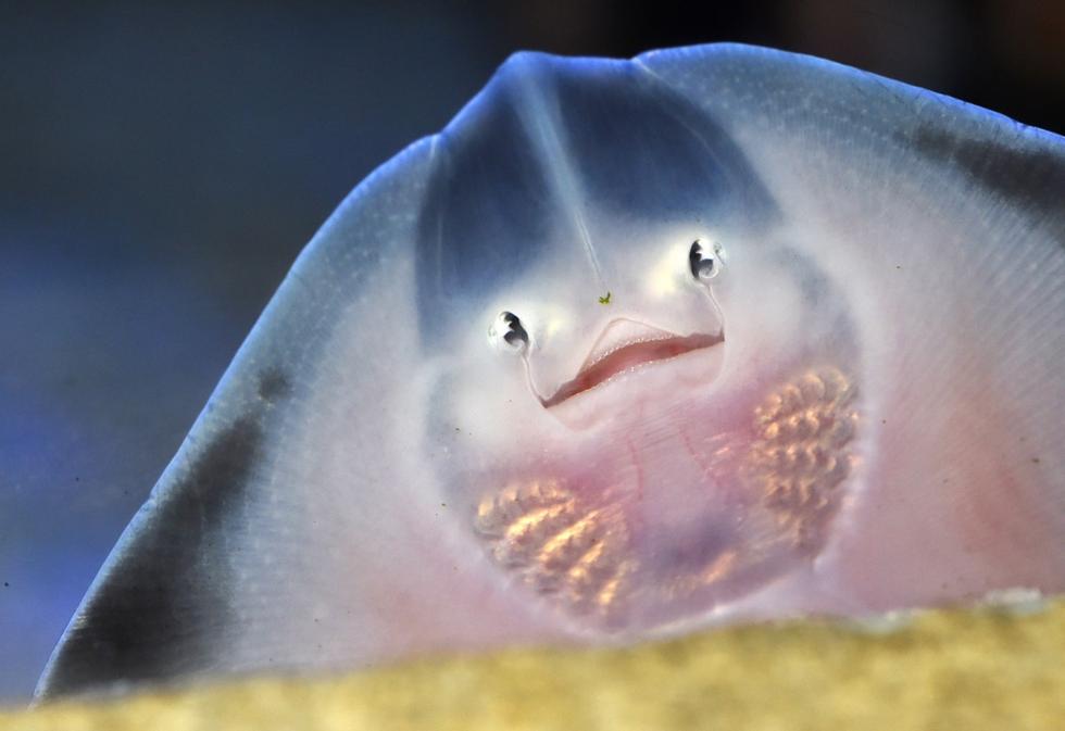 这只扁平的像巴掌一样的萌物叫鳐形目鱼,这家水族馆里有五只这种目鱼,都只有2岁零3个月大,它们和两只大喙篦鲛一起在“水族馆幼儿园”里,再过几个月等它们长大了在送到专门的鳐形目鱼池里。它头上长得像眼睛的东西其实是它腹部的腮。