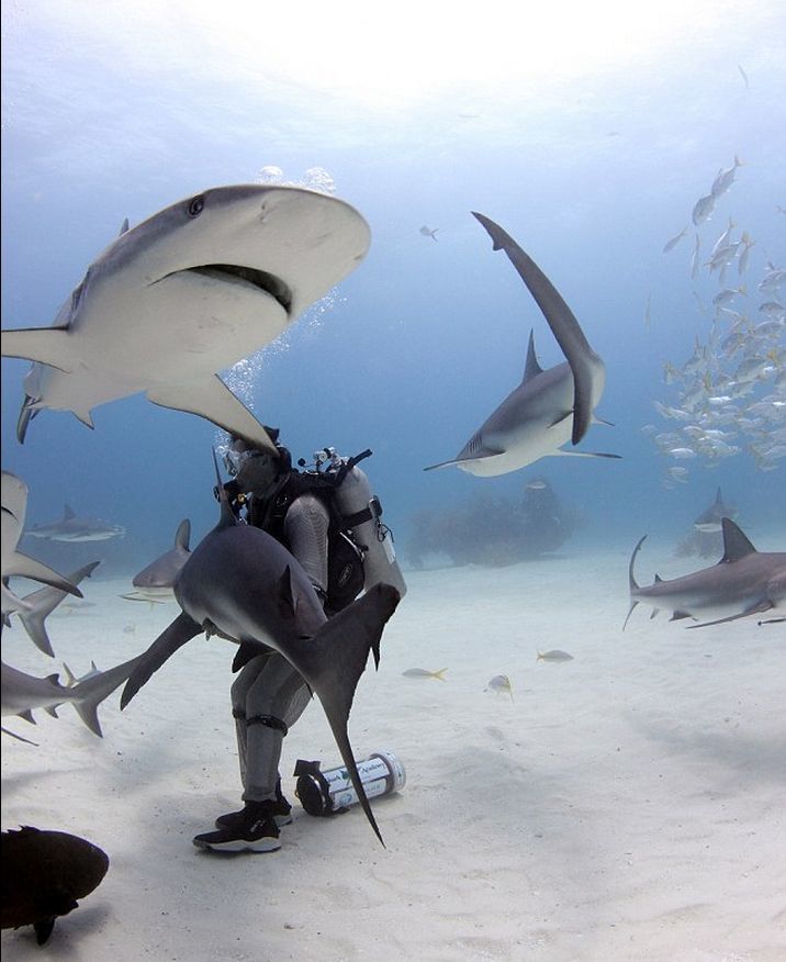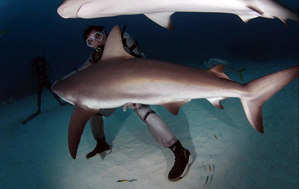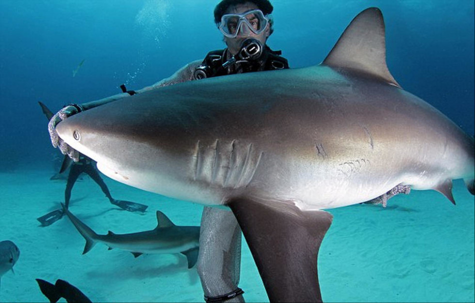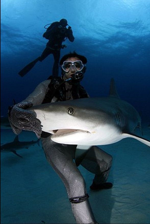 潜水员抚摸鲨鱼的鼻吻部让它们平静和放松下来,甚至可以让它们进入无意识状态以便研究者操作。