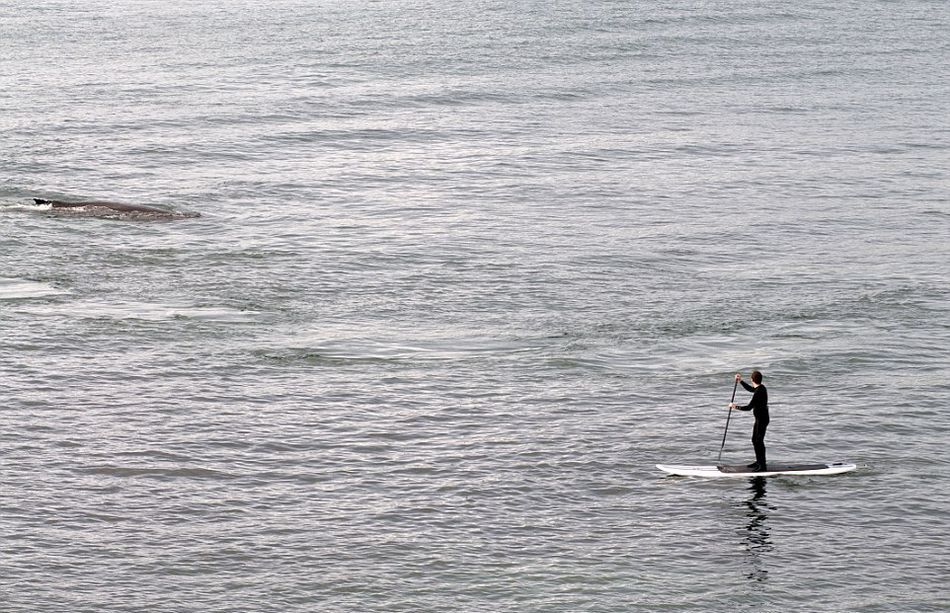 詹森和同伴在海滩冲浪漂移时,一头座头鲸突然在他旁边破水而出。