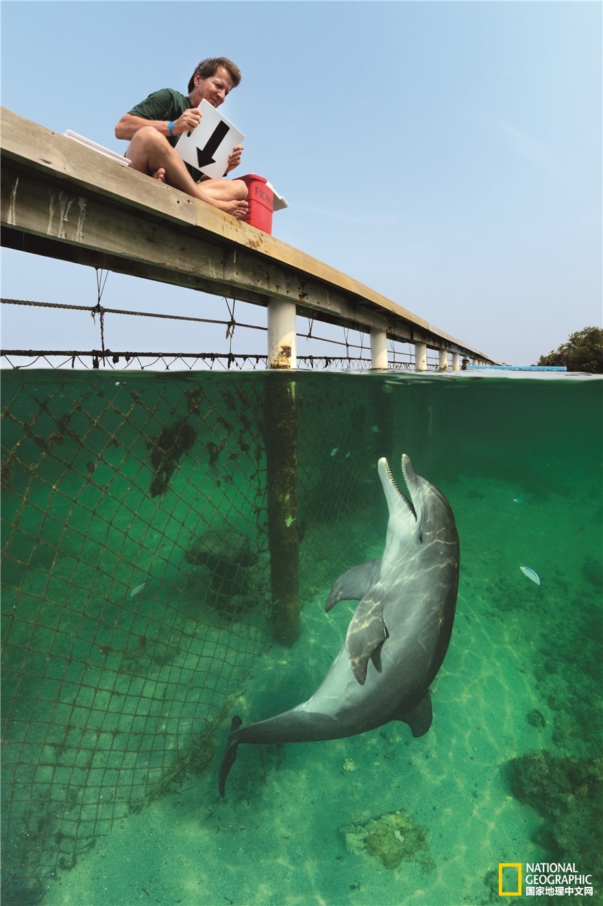 读懂斯坦·库查耶的指令——箭头表示“沉到海底”——对罗阿坦的宽吻海豚而言易如反掌。“观察海豚解决问题的过程是了解它们如何思考的根本。”