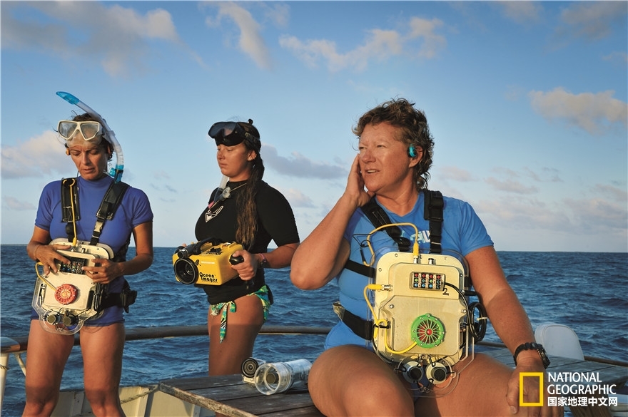 德尼斯·赫青(右)在巴哈马海域研究海豚,她随身佩戴的计算机能模拟海豚的哨音,她希望借此打下基础,在人类和海豚之间建立起共同语言。