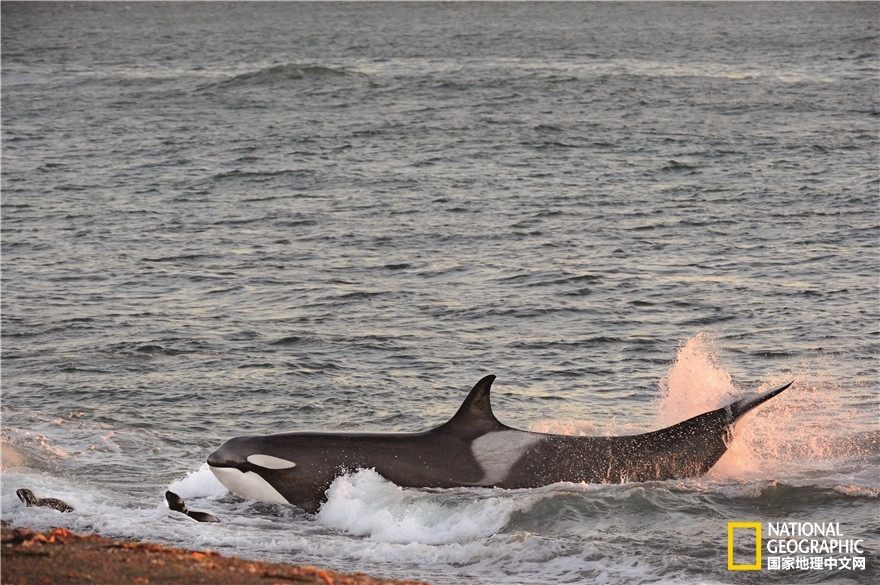 为了捕捉海狮幼崽,一只虎鲸冲上阿根廷蓬塔诺特的海岸。虎鲸是体型最大的海豚。这种冒险的行为——有时虎鲸会因此搁浅——代代相传,而且只在少数地区才能见到。