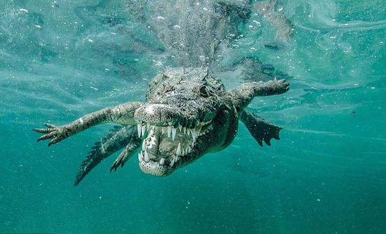 水下摄影师卡斯蒂洛在古巴附近水域抓拍到咸水鳄照片