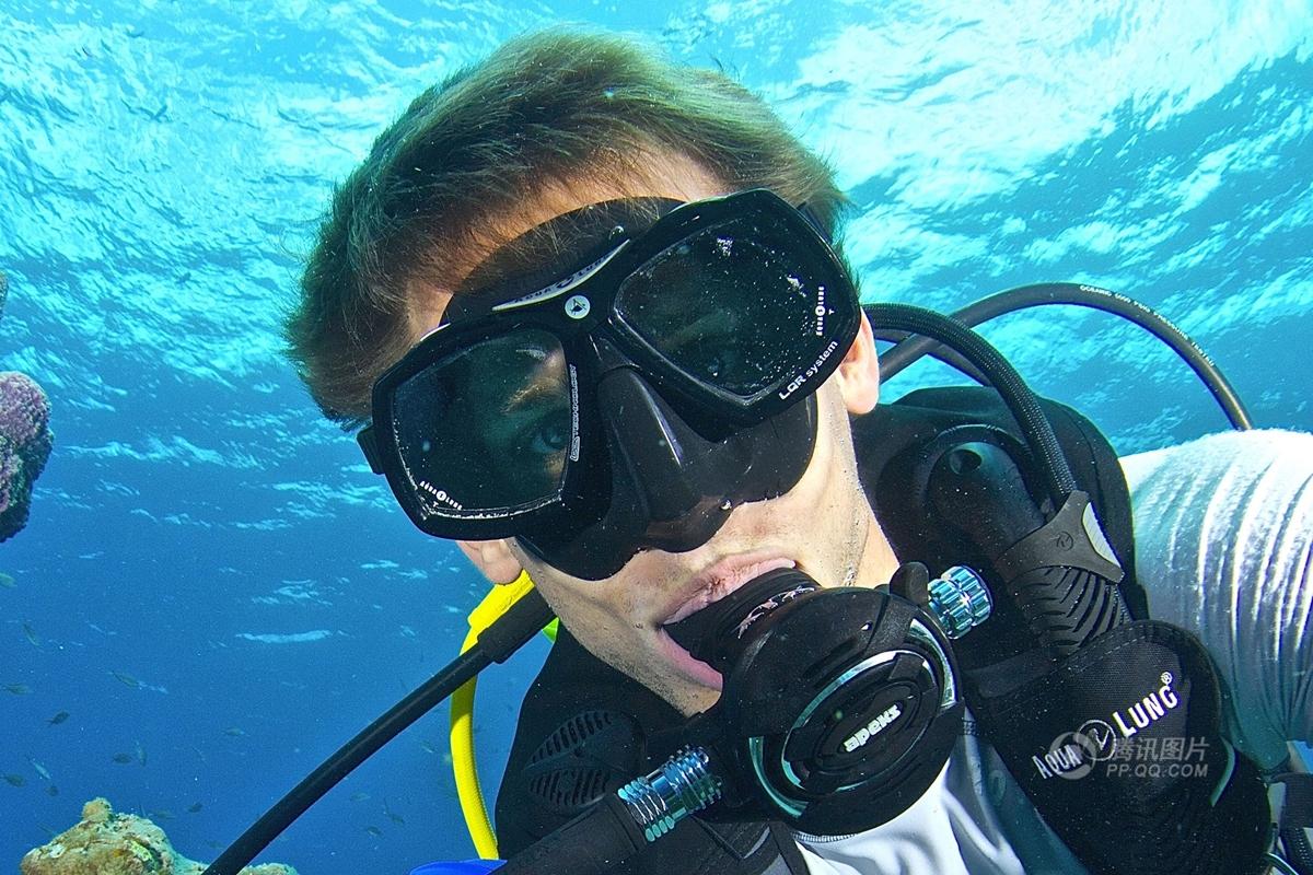 2015年4月10日报道,墨西哥卡布帕摩珊瑚礁区,偶遇鱼群“龙卷风”的潜水者Jeff。
