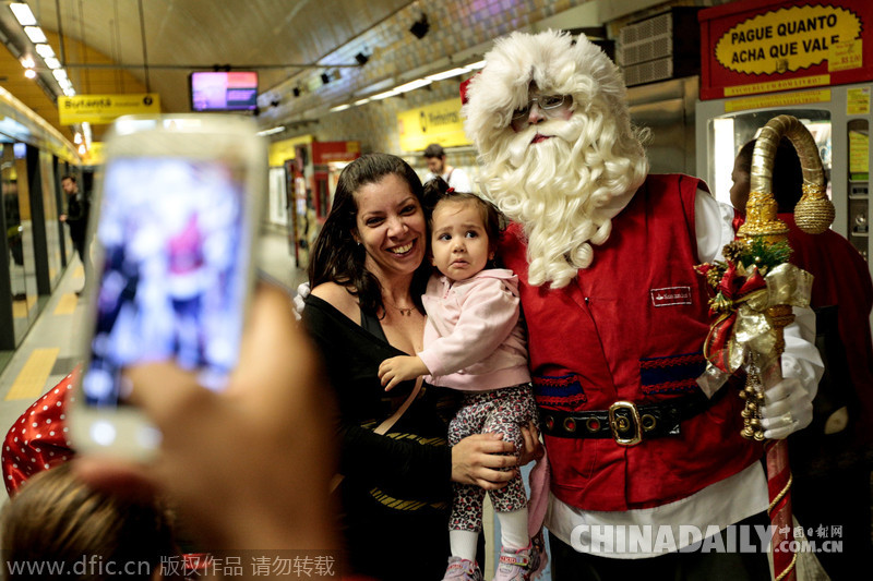 当地时间2014年12月24日,巴西圣保罗,圣诞老人与他的小精灵乘坐地铁,与乘客们一起庆祝圣诞节。图为圣诞老人与一名母亲和她的孩子合影。