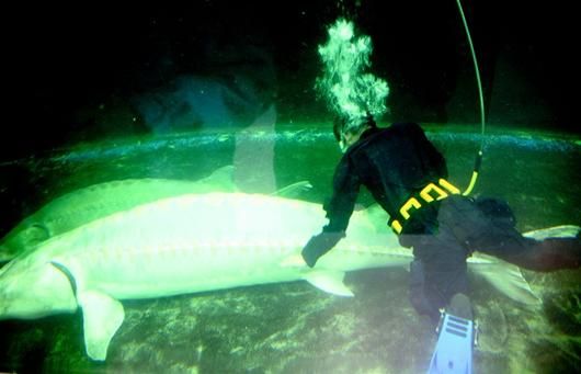湖北日报讯 21日,荆州太湖基地生态车间,潜水员辅助受伤的中华鲟游泳。这条中华鲟于15日被武汉市新洲渔民在长江意外捕获,长约3.3米、重约700斤。中国水产科学研究院长江水产研究所4名工程师和荆州太湖基地10名工作人员组成救治小组,24小时不间断对中华鲟进行监测和救治。