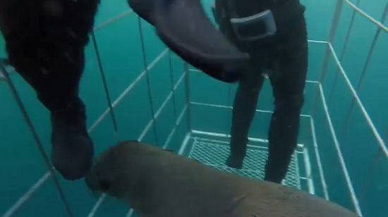 据报道,一名潜水员本月初钻进防鲨铁笼,潜入南非海底拍摄大白鲨,没想到竟多了一名不速之客陪伴。一只非洲毛皮海狮为了逃避大白鲨的攻击,径直游进铁笼内。