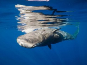 抹香鲸头重尾轻,宛如一头巨大的蝌蚪,头部占去全身的三分之一,看上去像个大箱子。鼻孔也很特殊,只有左鼻孔畅通,且位于左前上方,右鼻孔堵塞。所以,它呼气时喷出的雾柱是以四十五度角向左前方喷出的。