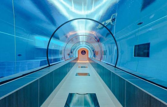泳池中有完全透明的悬浮水下通道,不游泳的游客可不必湿身体验泳池乐趣