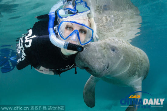 中国日报网9月25日电(欧叶)据当地时间25日报道,梅雷迪思和科拉贝尔赫姆在美国佛罗里达水晶河野生动物保护区潜水时遇到了一群海牛,海牛面对镜头一点也不羞涩,反而很积极,还忍不住追着美女,趁机献吻。