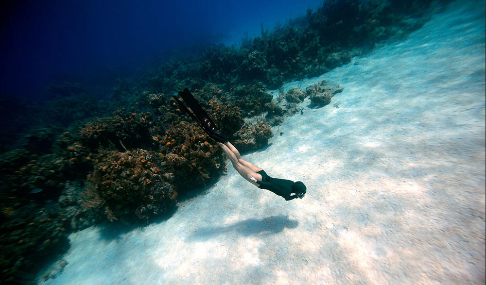 在训练课程中,克里斯蒂娜往海洋的更深处潜去。一望无际的大海中,人显得格外渺小。