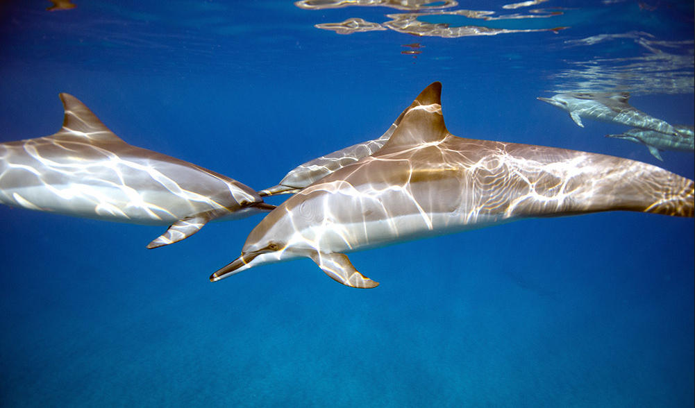 在夏威夷附近的海域,他们则与飞旋海豚进行了一次亲密的约会,跟随在海豚群后自在畅游。