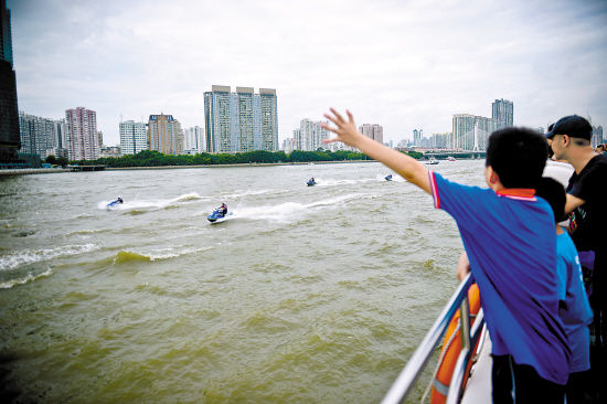 在“羊城”号二楼甲板上极目远眺,发现一艘艘不同规格的船艇列队正从远处驶来,由8名蛙人驾驶着8艘摩托快艇列队飞快驶过,并在水面上演连环追击。