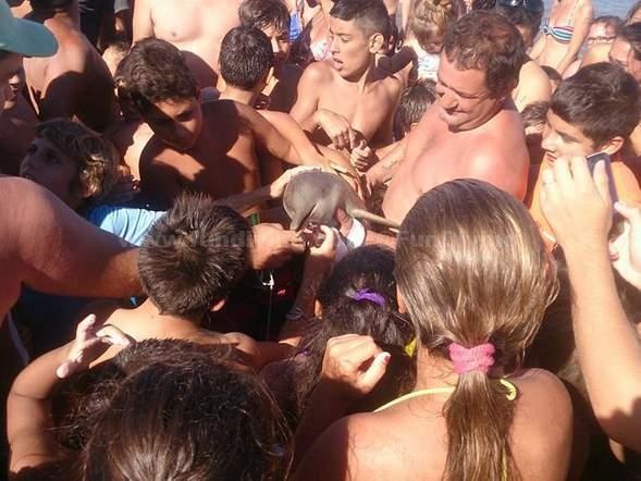 今年2月,在阿根廷的拉普拉塔海湾,一群游客将一只搁浅的珍稀海豚宝宝从水中捞出,大家争相抚摸海豚并与之合影留念。最终这只小海豚因脱水太久而无辜丧命。图为游客争相抚摸海豚。