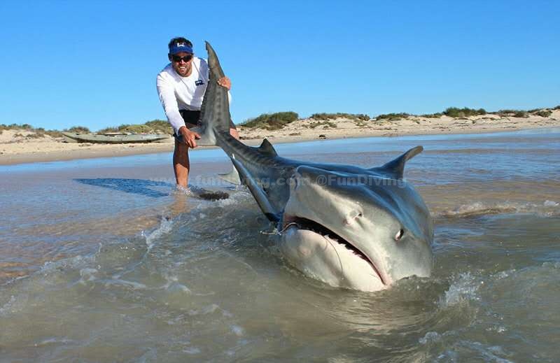 近日,澳大利亚埃斯佩兰斯两名渔民在西澳大利亚北部海岸为期4天的捕鱼行动中,成功捕获10头大型虎鲨,他们钓到鲨鱼后会和鲨鱼合照,再将鲨鱼放回大海。