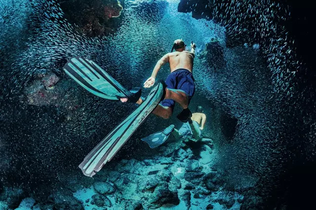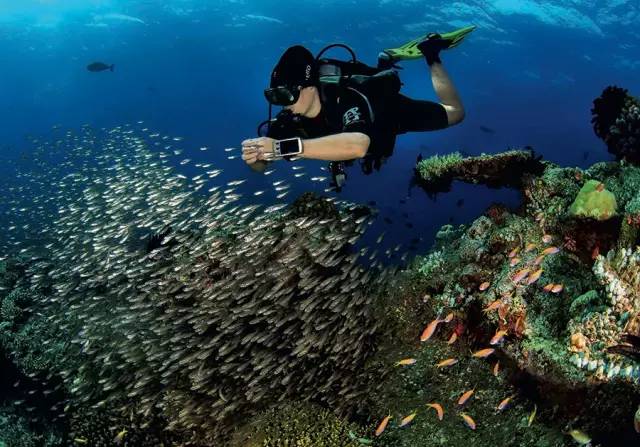 潜水者融入了鱼群当中,一同畅游 F11,1/125秒,ISO125