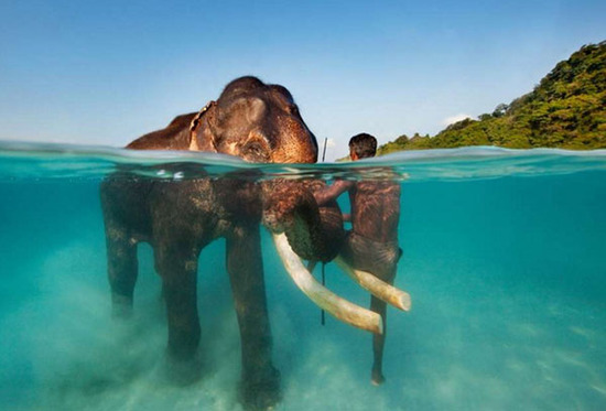 在印度安达曼群岛,驯象师带着大象洗海水浴的情景,如此和谐动人