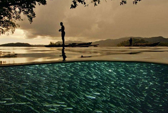 夕阳下的印尼拉贾安帕特群岛,渔夫悠然立于群鱼之上