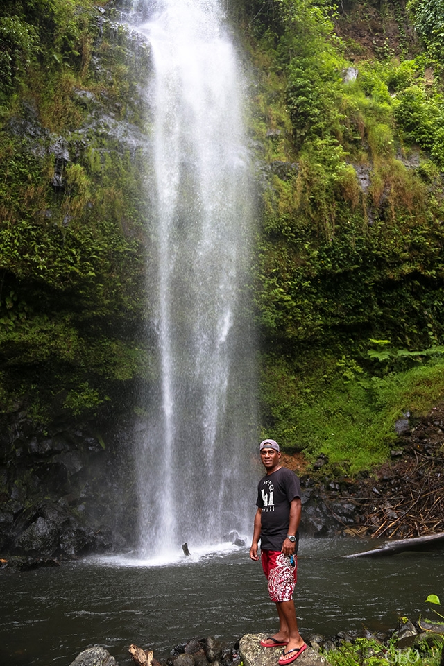 在环岛路上偶遇一位当地人Justin,很热情地邀请我去他家参观,带我沿着他家后一条山间小路去看了一条隐秘的瀑布。波纳佩是世界上降水量最大的地方之一,淡水丰富,瀑布众多。在去瀑布的路上经过一户人家,房舍是开放式的,没有门窗,家里没有人,Justin说村民们家里的东西都是可以随便吃的,说完便翻出了面包果、香蕉,甚至找到了锅里刚煮好的牛尾,我们享用一番再接着上路。波纳佩岛由于很孤立,岛上生态与大陆迥然不同,没有任何可以伤害人的虫蛇鸟兽之类,岛民又非常淳朴,犯罪率低,所以这种开放式的房舍随处可见。