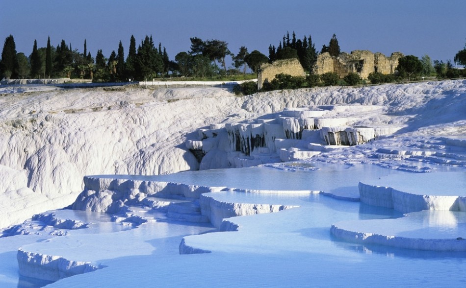 自远古时期,棉花堡就有这样的情景:蓝绿色的水流进白如棉花的阶梯形的石灰华(一种多孔碳酸钙)水池,碳酸钙的沉淀物使得这些温水池熠熠生辉。