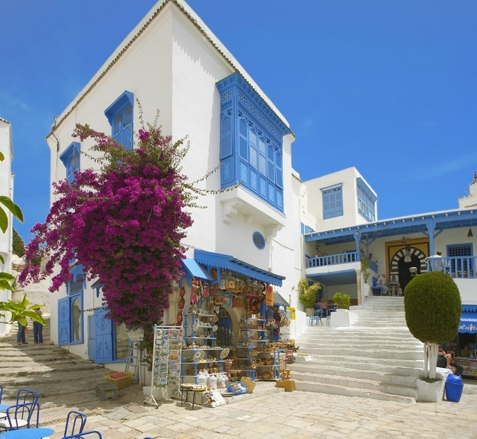 突尼斯城以北,地中海南岸,坐落着北非最美丽、最浪漫的小镇“蓝白小镇”,因为白、蓝两色是该镇的代表色。放眼望去,白色的房屋依山而建,错落有致,所有的院门、窗户和楼梯扶手全都被漆成天蓝色,与地中海蔚蓝色的海水构成和谐的画面。