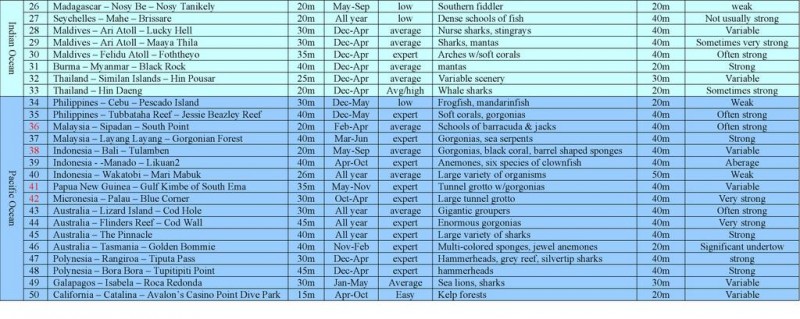 下面两张图是全球50最佳潜点的详细信息,包括潜点名字,最大深度,最佳季节,难易程度,看点,能见度和流的强弱。图片看起来很小,请保存在手机上放大查看。(要是有哪位好心人能制成中文表格,也请发给我一份)