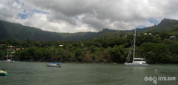 这是非常著名的一个群岛(Galapagos),也是在太平洋上离巴拿马最近的一个岛屿,但却是厄瓜多尔所有,岛上风光如画,是帆船爱好者的天堂,上面植物保护很好,更值得关注的是千万年前火山喷发后留下千奇百怪的石头。由于晚上到达,我们无法靠岸,只有在锚地外停留一晚,第二再找岛内避风港湾停靠休整船只。